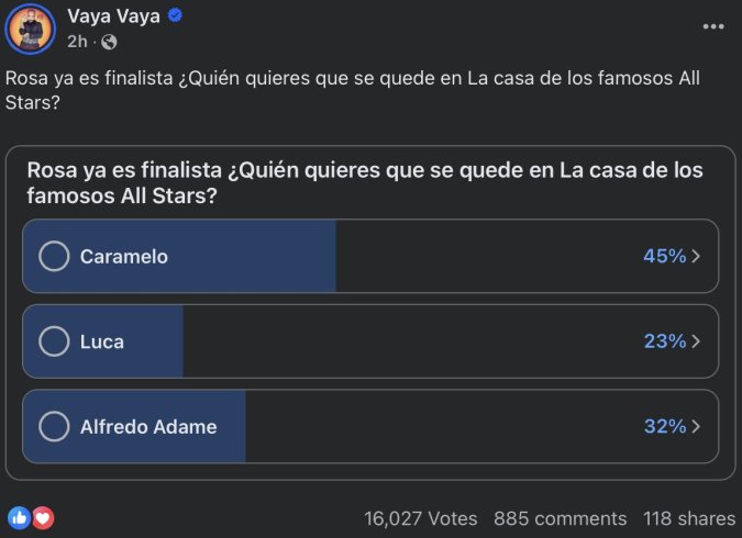 Un resultado similar tiene Universo Reality, una cuenta de Telegram que también se encarga de seguir el programa de telerrealidad. Según estos números, Caramelo tiene 47 % de los votos, le sigue Adame con 27 % y en el último eslabón está Luca Onestini.