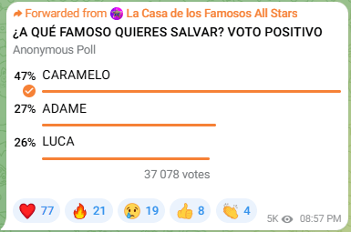 Un resultado similar tiene Universo Reality, una cuenta de Telegram que también se encarga de seguir el programa de telerrealidad. Según estos números, Caramelo tiene 47 % de los votos, le sigue Adame con 27 % y en el último eslabón está Luca Onestini.