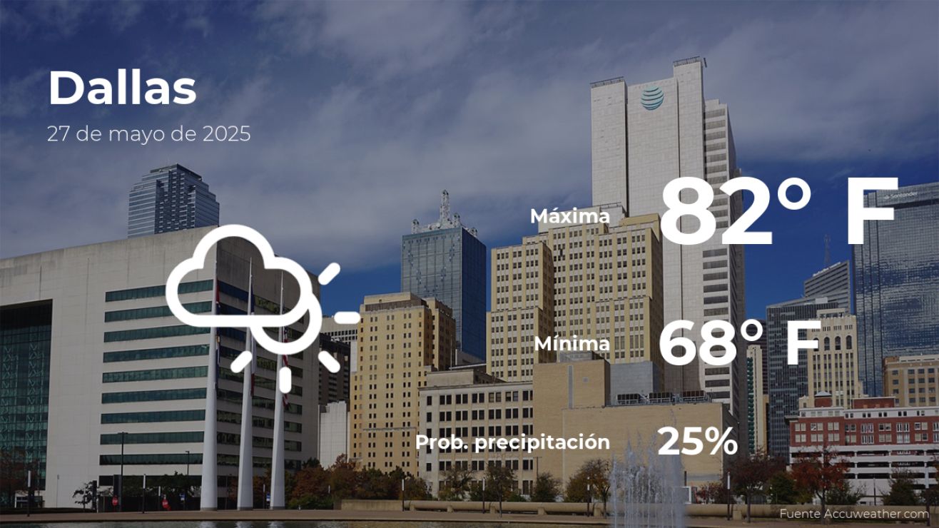 Este martes 27 de mayo se espera que la temperatura en Dallas, Texas, logre un máximo de 82 grados Fahrenheit (28ºC). La probabilidad de lluvia será del 25% y se prevén más nubes que claros. Por otro lado, las predicciones estiman ráfagas de viento que podrán llegar a 5.59 millas por hora.