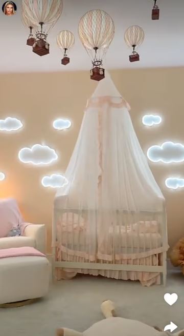La influencer también mostró la cuna de la pequeña sobre la cual cuelga un delicado velo blanco con holanes en un tono rosa tenue, mientras que la pared de fondo habían varias decoraciones con luces en forma nubes.