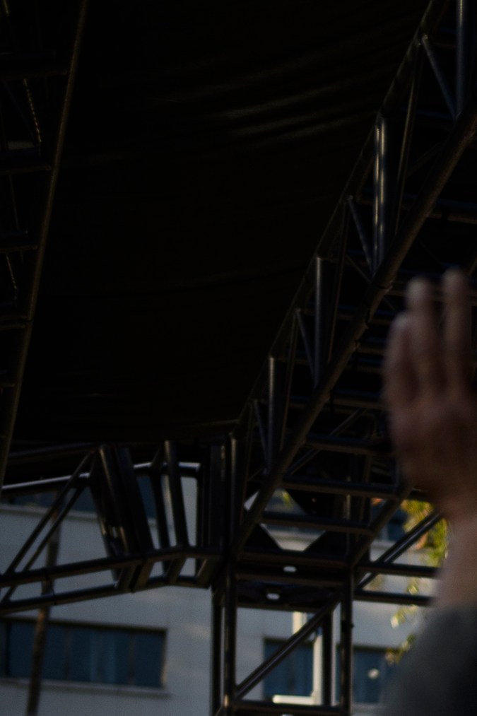 Asistentes levantan la mano durante un rezo durante la vigilia liderada por líderes interreligiosos en el parque Gloria Molina en Los Angeles. Crédito: Fotos: Isaac Ceja | Impremedia