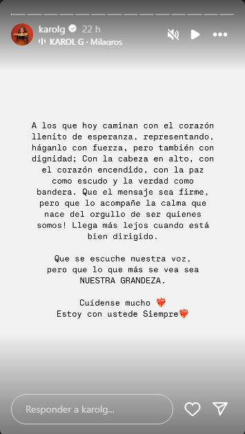 Karol G dirigió unas palabras de aliento a las familias que atraviesan momentos difíciles: “A las familias que hoy viven momentos de miedo, de pérdida, de agobio… estoy con mi gente. Siempre”.
