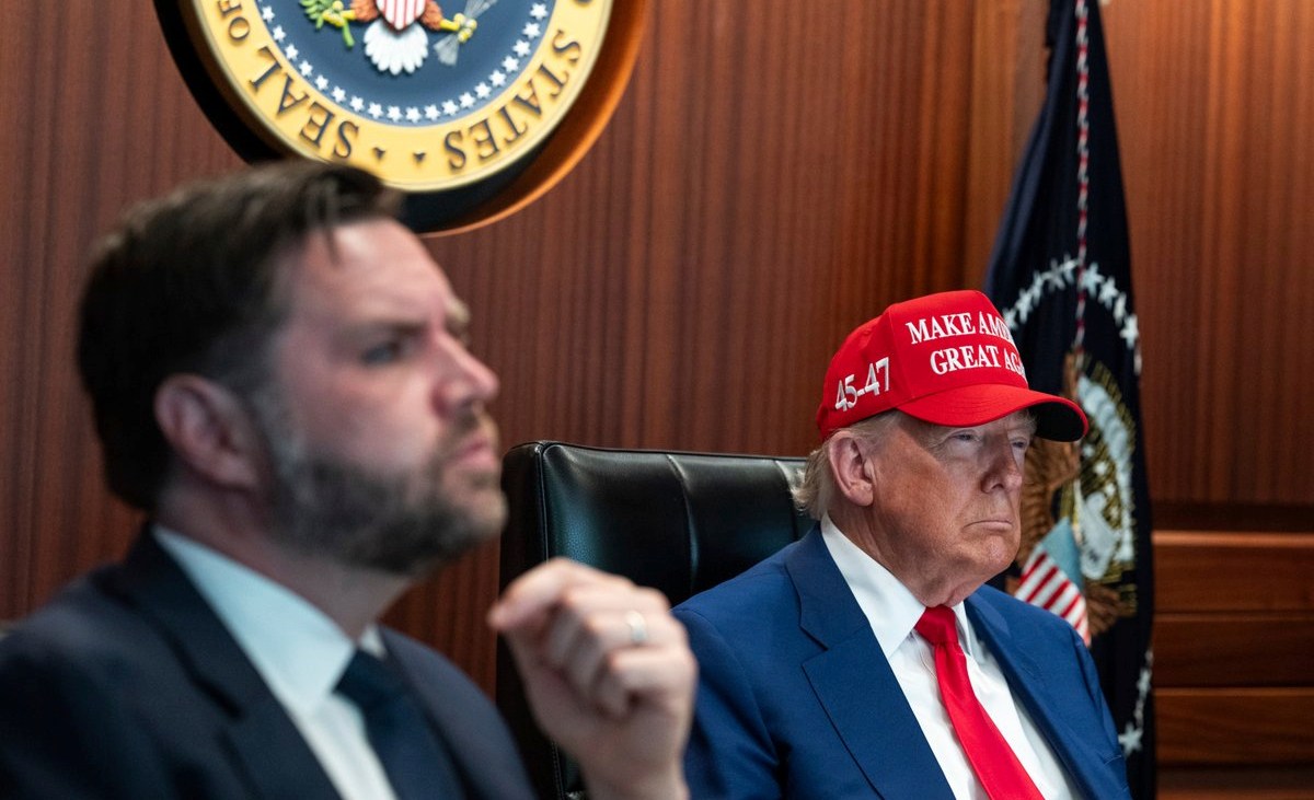 El presidente Donald Trump (d), y el vicepresidente J.D. Vance en la Sala de Situación, el sábado 21 de junio de 2025, en la Casa Blanca. Crédito: The White House | AP