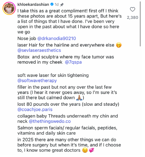 Khloé, de 40 años, no tardó en aclarar las cosas en los comentarios: “Tomo esto como un gran cumplido”, escribió antes de enumerar cada procedimiento de manera detallada y en forma de lista: