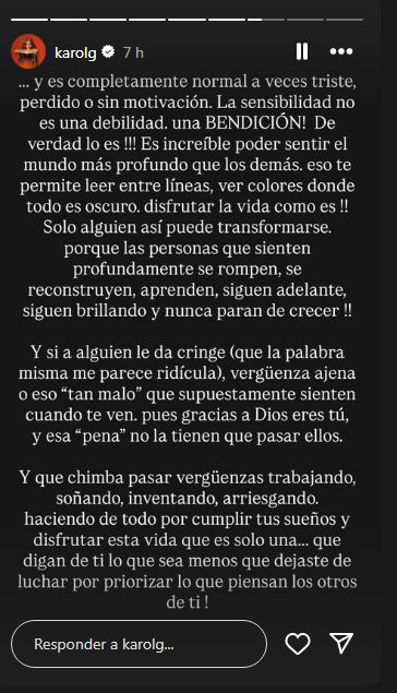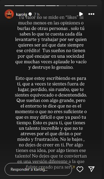 Después de compartir esta reflexión, Karol G aprovechó para compartir un mensaje de aliento con sus seguidores que pudieran estar atravesando una situación similar.