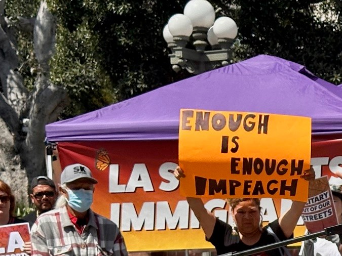 “Quiero decirle a nuestra comunidad que no están solos. Vamos a luchar hasta que la migración y todas las agencias federales salgan de Los Ángeles porque queremos justicia y que la gente se sienta segura”, dijo Angélica Salas, líder de la Coalición por los Derechos de los Inmigrantes (CHIRLA).