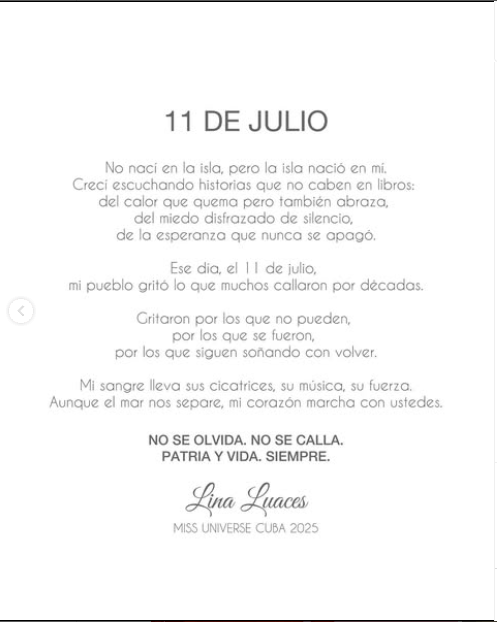Su texto lo tituló ’11 de julio’, ya que ese día, pero del 2021, se registraron unas protestas históricas por parte del pueblo cubano en contra del gobierno de la isla, con lo que quiso demostrar que, a pesar de la distancia y de no haber nacido ahí, ella siempre ha estado de lado de sus paisanos y no solo cuando le surgió la posibilidad de representar a la isla en Miss Universo.