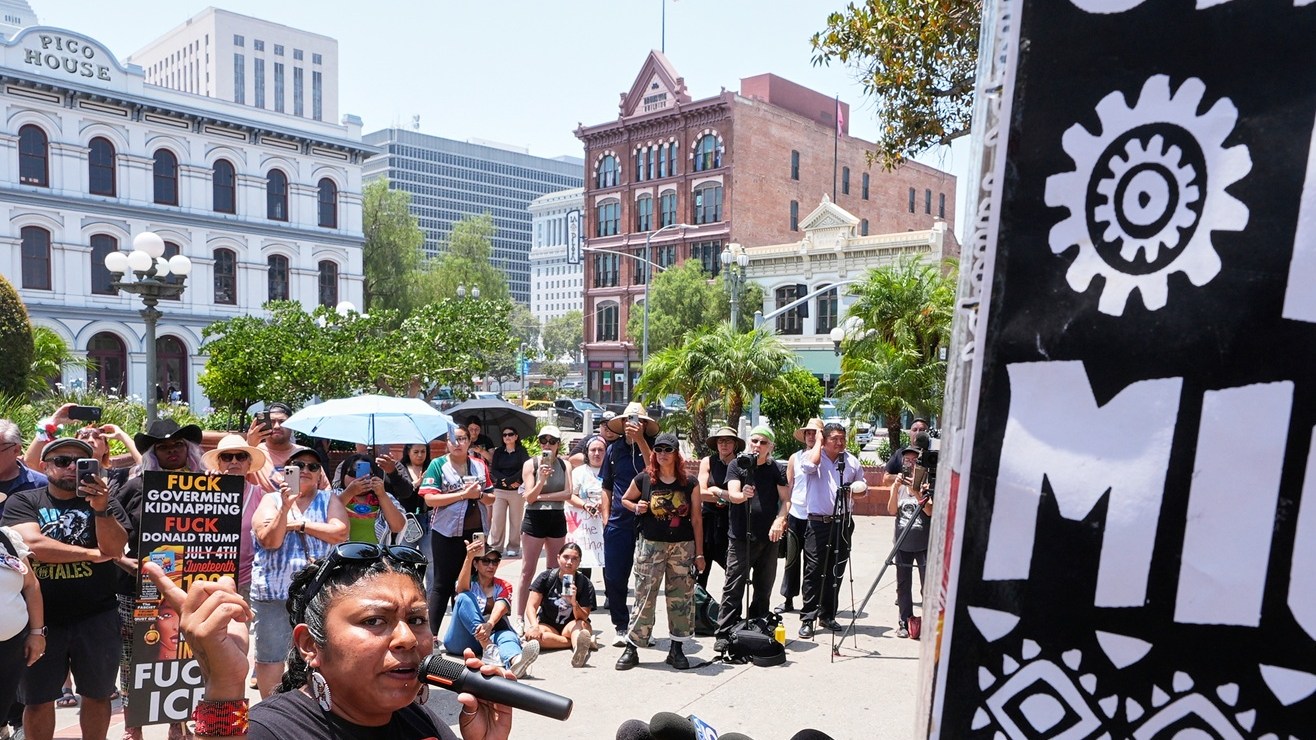 La activista y trabajadora agrícola Xochitl Núñez anuncia una "Huelga Nacional de Trabajadores Agrícolas por la Dignidad" ante redadas de ICE. Crédito: Damian Dovarganes | AP