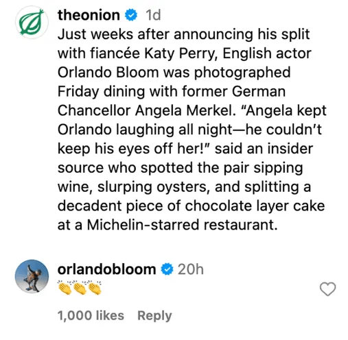 Todo comenzó cuando The Onion, el famoso sitio de noticias satíricas, publicó en Instagram un titular falso que decía: “Orlando Bloom visto cenando con Angela Merkel”. La publicación, claramente una parodia de los recientes rumores sobre Perry y Trudeau, incluía una descripción humorística: “Angela hizo reír a Orlando toda la noche; ¡no podía quitarle los ojos de encima!”.