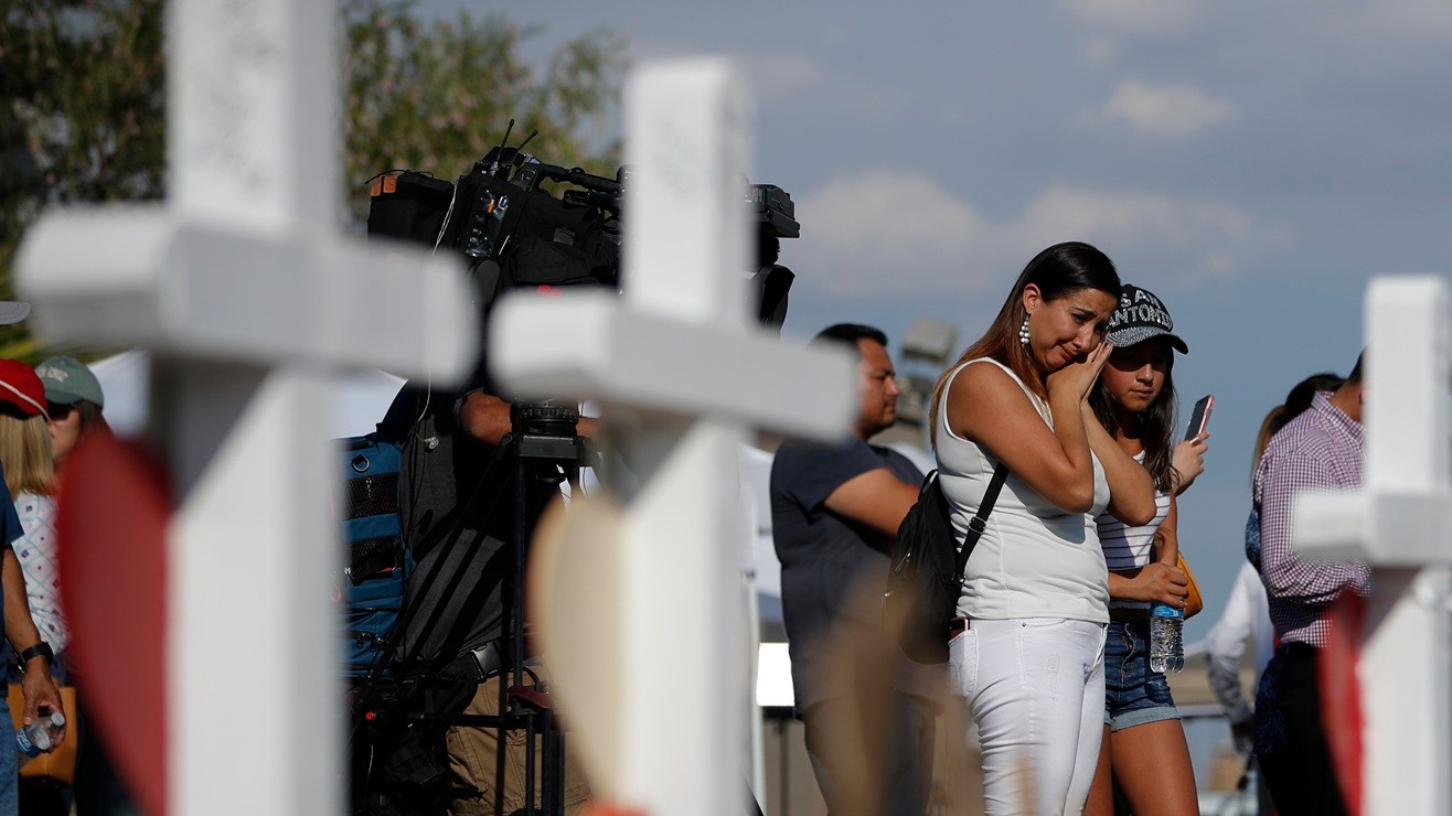 Personas visitan un monumento improvisado en el lugar de un tiroteo masivo en un centro comercial de El Paso, Texas.  Crédito: John Locher | AP