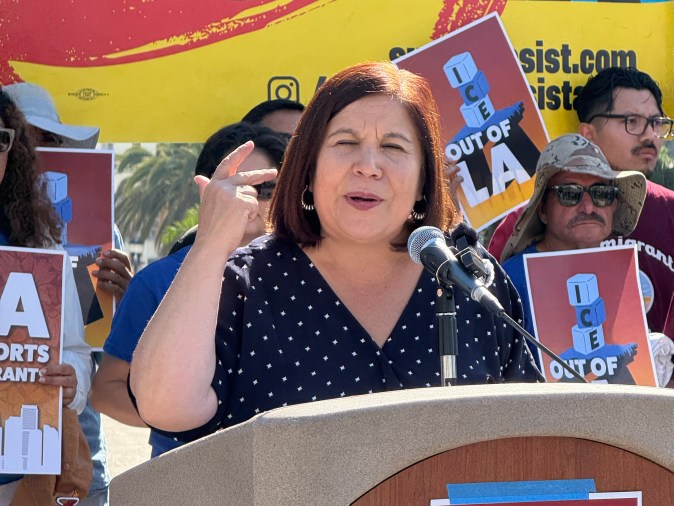 “Ayer, en nuestro centro de jornaleros, frente a Home Depot, no muy lejos de aquí, las fuerzas de inmigración atacaron nuestra comunidad. Vi a los vendedores ambulantes corriendo para regresar con sus familias esa noche, para salvar sus vidas y sus sueños”, dijo Martha Arévalo, directora de CARECEN.