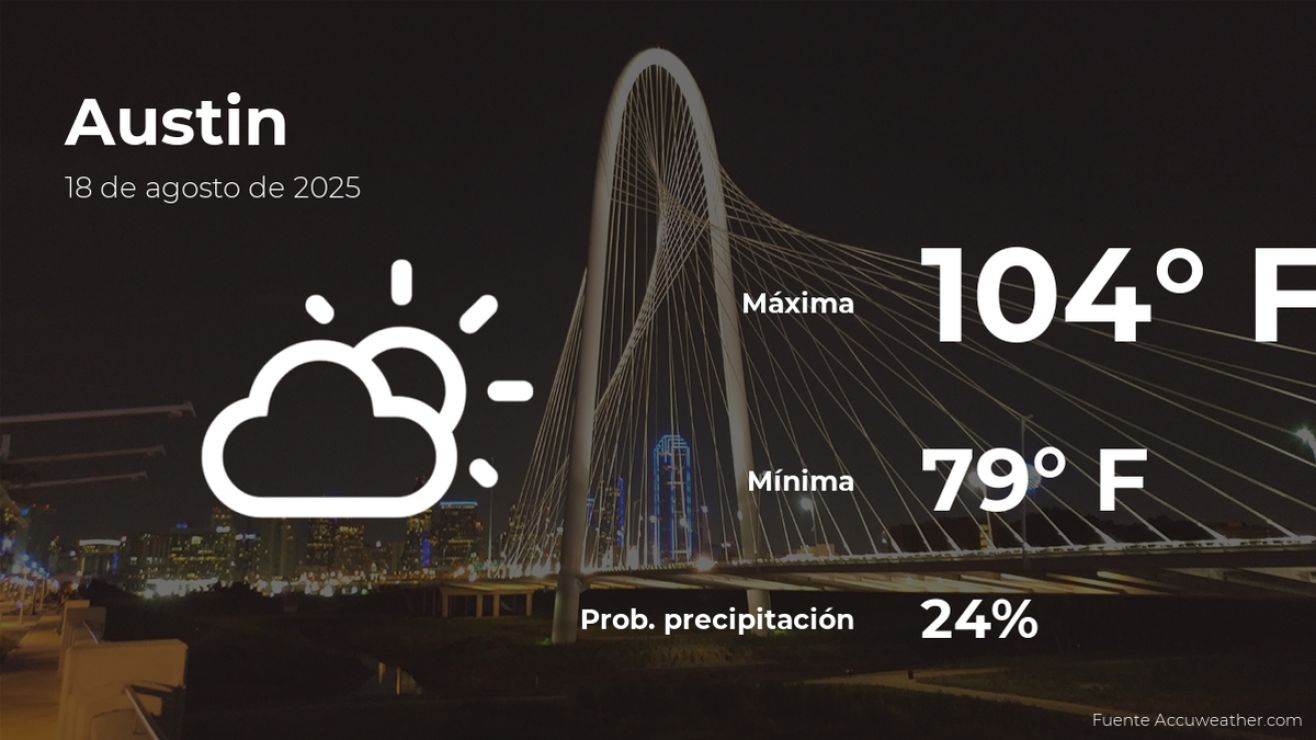 Durante la mayor parte del día en Austin, Texas, se espera escasa nubosidad. Se espera una temperatura máxima de 104 grados Fahrenheit (40ºC) alrededor de las horas centrales del día y una temperatura mínima de 79 grados Fahrenheit (26ºC) durante la madrugada. También se espera un viento del sudeste, que rondará los 5.59 mph en el día. El porcentaje de nubes será del 12%.