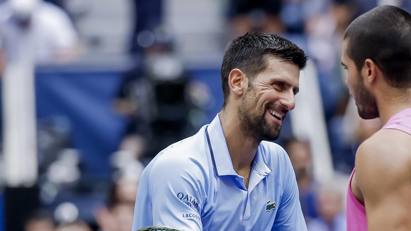 Novak Djokovic y Carlos Alcaraz se saludan tras el duelo en semifinales de US Open. Crédito: John G. Mabanglo | EFE