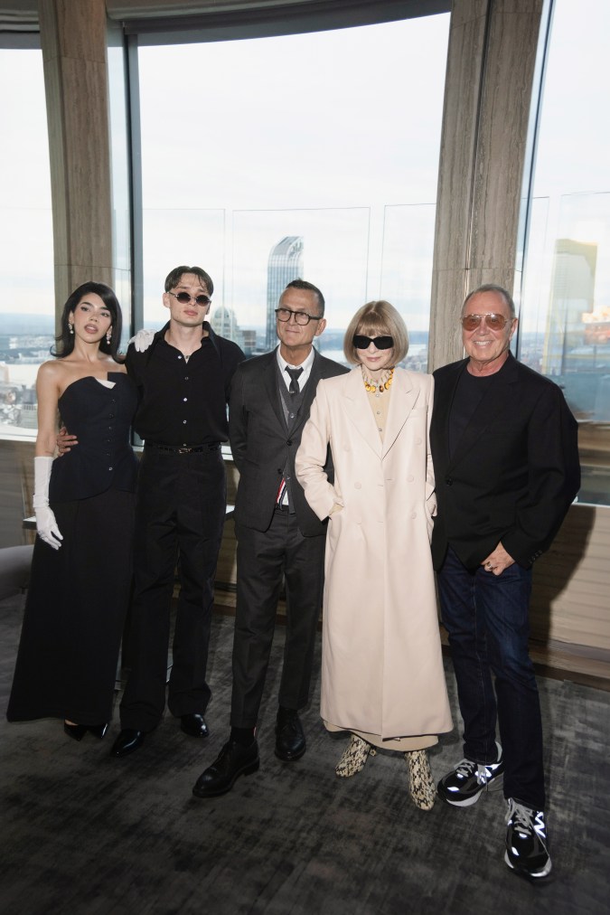 Entre el público de lujo estaban figuras clave de la industria: Thom Browne, presidente del CFDA; Anna Wintour, legendaria exeditora de Vogue Estados Unidos; los diseñadores Michael Kors y Anna Sui; así como las embajadoras del evento, la modelo egipcia Anok Yai y la cantante boricua Young Miko, quien compartió escenario con Peso Pluma en el desfile otoño/invierno 2025 de Browne, donde el artista hizo su debut en NYFW a principios de este año.