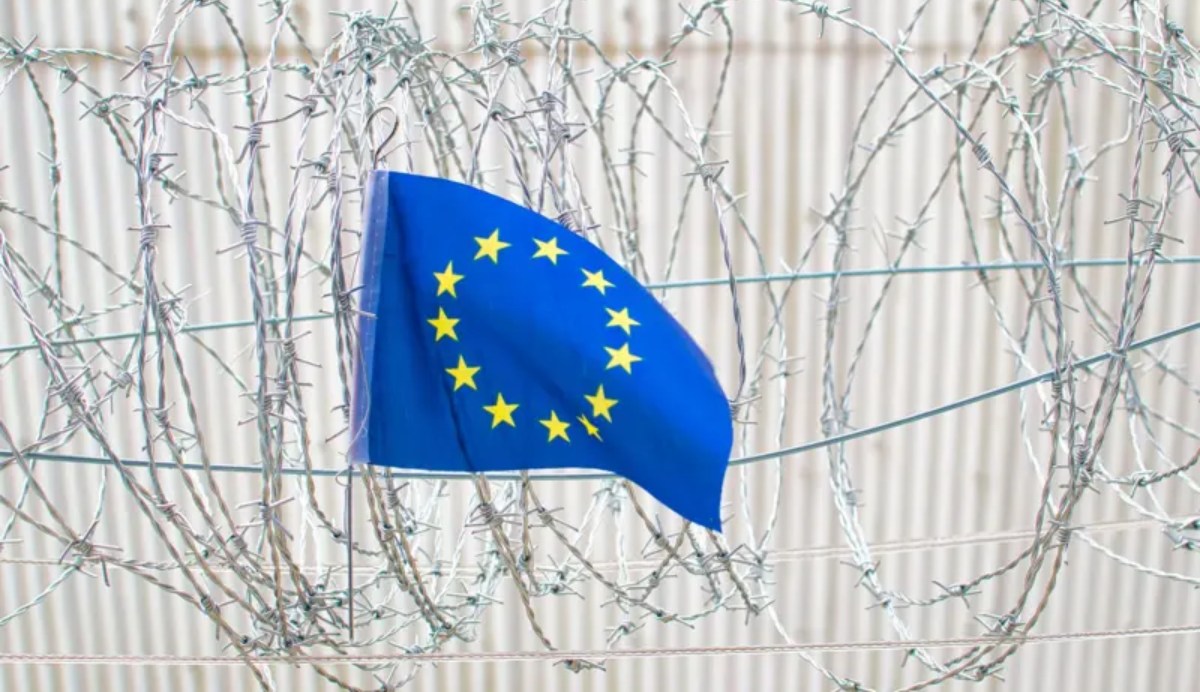 La bandera de la UE frente a una valla con alambre de púas. Crédito: Getty Images