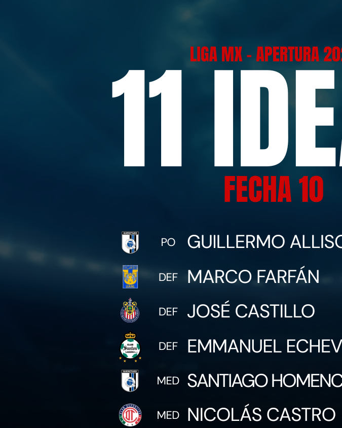 Data Factory, también eligió al portero de los Gallos Blancos Guillermo Allison con un 7.1 de calificación, así como el defensa de Tigres Marco Farfán con 7.2, José Castillo de Chivas con 7.0, Emmanuel Echeverría de Santos 7.3, Richard Ledezma de Chivas 7.4 y el colombiano James Rodríguez del León 7.4.