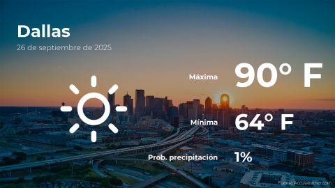 Este viernes 26 de septiembre se espera que la temperatura en Dallas, Texas, aumente hasta un máximo de 90 grados Fahrenheit (32ºC). La probabilidad de lluvia será del 1% y se prevén cielos sin nubes. Además, el pronóstico estima ráfagas de viento de hasta 4.35 millas por hora.