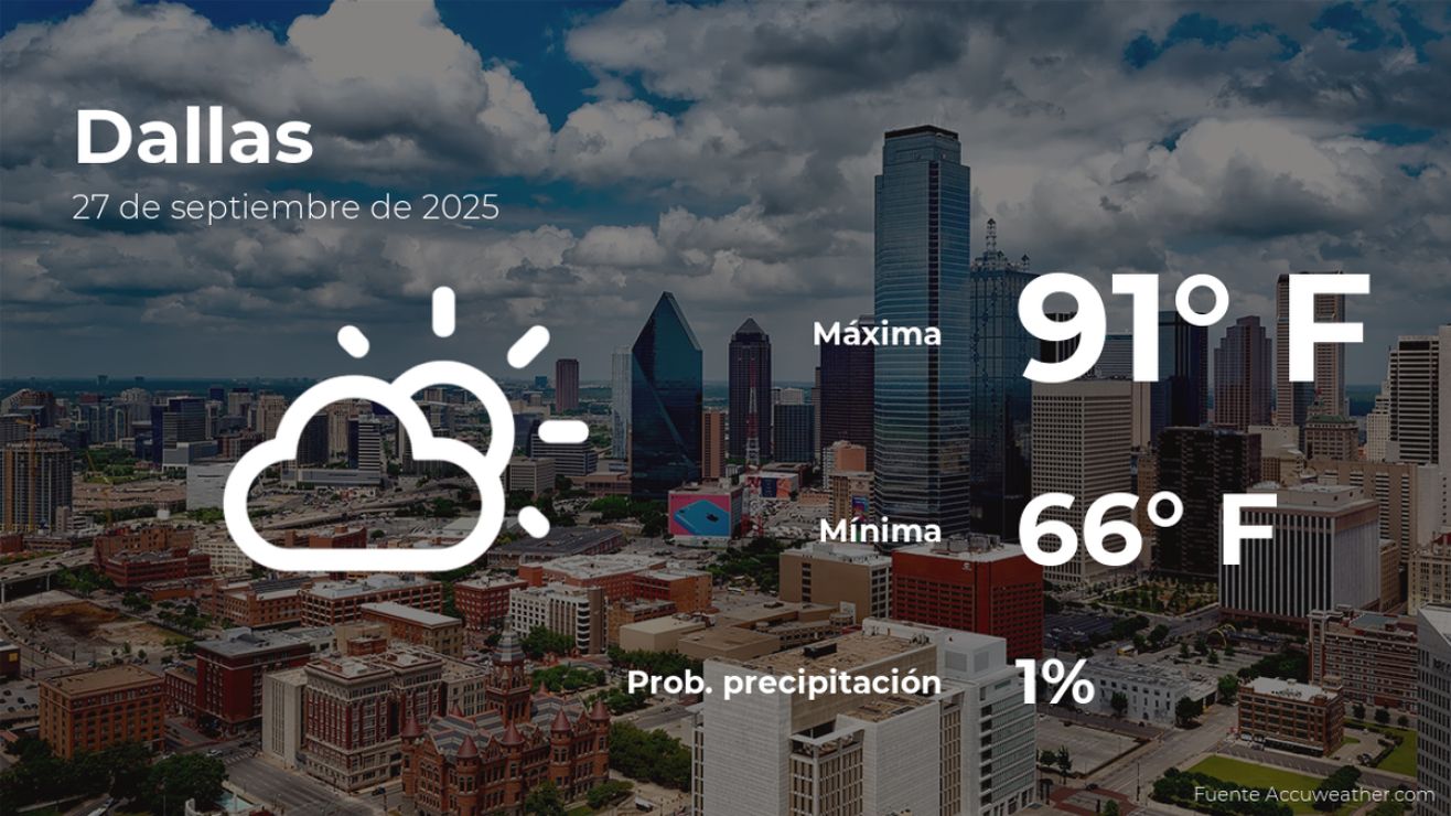 Este sábado 27 de septiembre se espera que la temperatura en Dallas, Texas, logre un máximo de 91 grados Fahrenheit (33ºC). La probabilidad de lluvia será del 1% y tendremos pocas nubes. Por otro lado, el pronóstico estima ráfagas de viento de hasta 5.59 millas por hora.