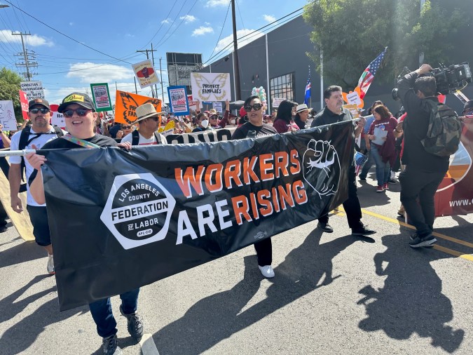 Los manifestantes, mayormente trabajadores sindicalizados del SEIU-USWW que son conserjes, oficiales de seguridad, empleados de estadios y de aeropuertos en Los Ángeles marcharon una milla y media portando pancartas y mantas con la exigencia de ciudadanía y de repudio a las acciones de la Administración Trump contra los inmigrantes.