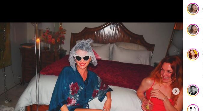 En una de las fotos, Selena aparece con una bata de seda azul y gafas blancas con un pequeño velo, acompañada de su amiga y excompañera de Wizards of Waverly Place, Jennifer Stone.