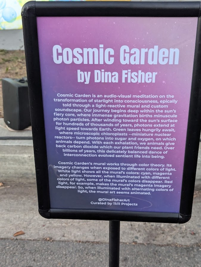 Un cuadro artístico – el Jardín Cósmico de Dina Fisher – se extiende y la luz proyectada va creando nuevas imágenes. La explicación dice: “El mural Cosmic Garden es una meditación audiovisual sobre la transformación de la luz de las estrellas en la conciencia, contada épicamente a través de un mural de reacción ligera y un paisaje sonoro personalizado”. ¿Se entiende?