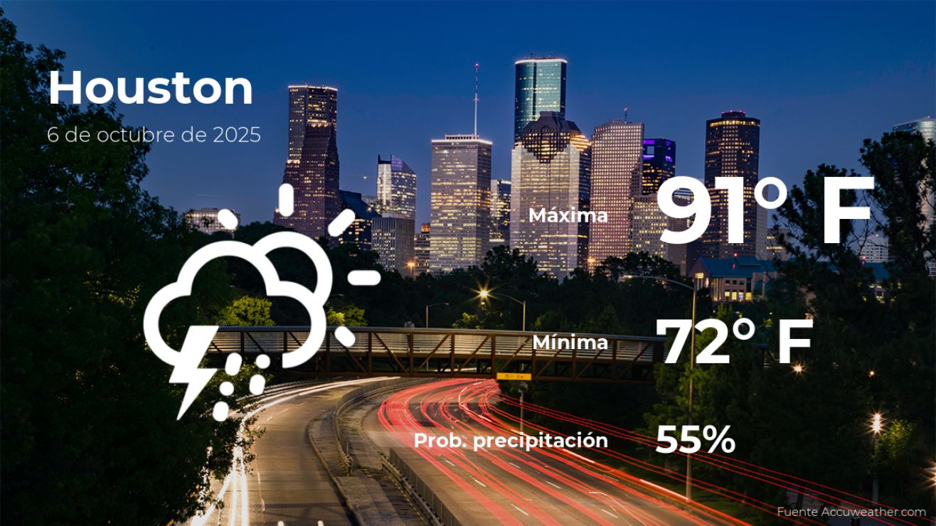 El clima en Houston, Texas, para este lunes 6 de octubre se basará en una variación entre nubes y claros. De acuerdo al parte meteorológico provisto por AccuWeather, la temperatura se incrementará hasta un total de 91 grados Fahrenheit (33ºC) de máxima durante el día, mientras que a la noche se registrará la temperatura más baja, con 72 grados Fahrenheit (22ºC) de mínima.