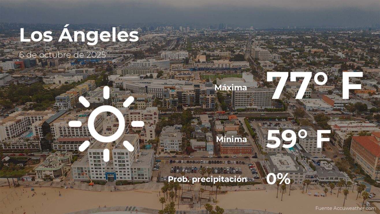 Comienzo del día en Los Ángeles, que se prepara para vivir un lunes con cielos sin nubes. Según la última información del parte meteorológico provisto por AccuWeather, la temperatura ascenderá hasta los 77 grados Fahrenheit (25ºC) de máxima durante el día, mientras que para la noche se esperan 59 grados Fahrenheit (15ºC) de mínima. Además, tendremos vientos del suroeste que soplarán con velocidades de 6.84 mph durante la jornada y de 4.35 durante la noche.