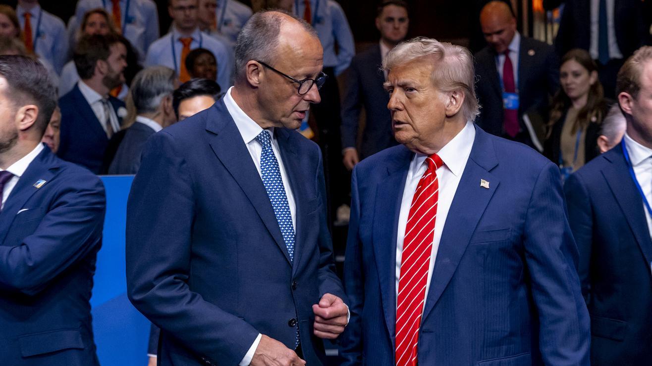 Merz (izquierda en la imagen) habla con Trump durante la cumbre de la OTAN de 2025 en La Haya, Países Bajos. Crédito: Deutsche Welle