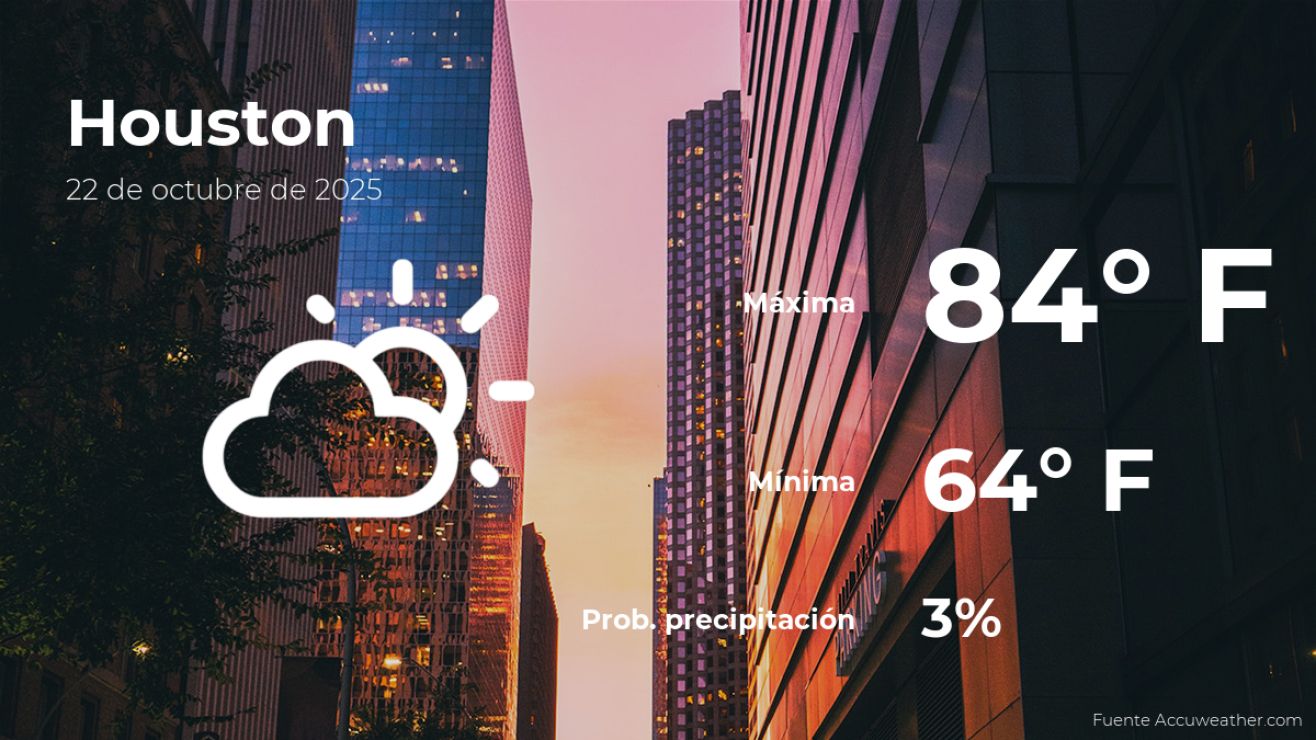 Encuentra el pronóstico meteorológico de hoy para Houston, Texas, cómo estará el tiempo y las condiciones climáticas este miércoles 22 de octubre.