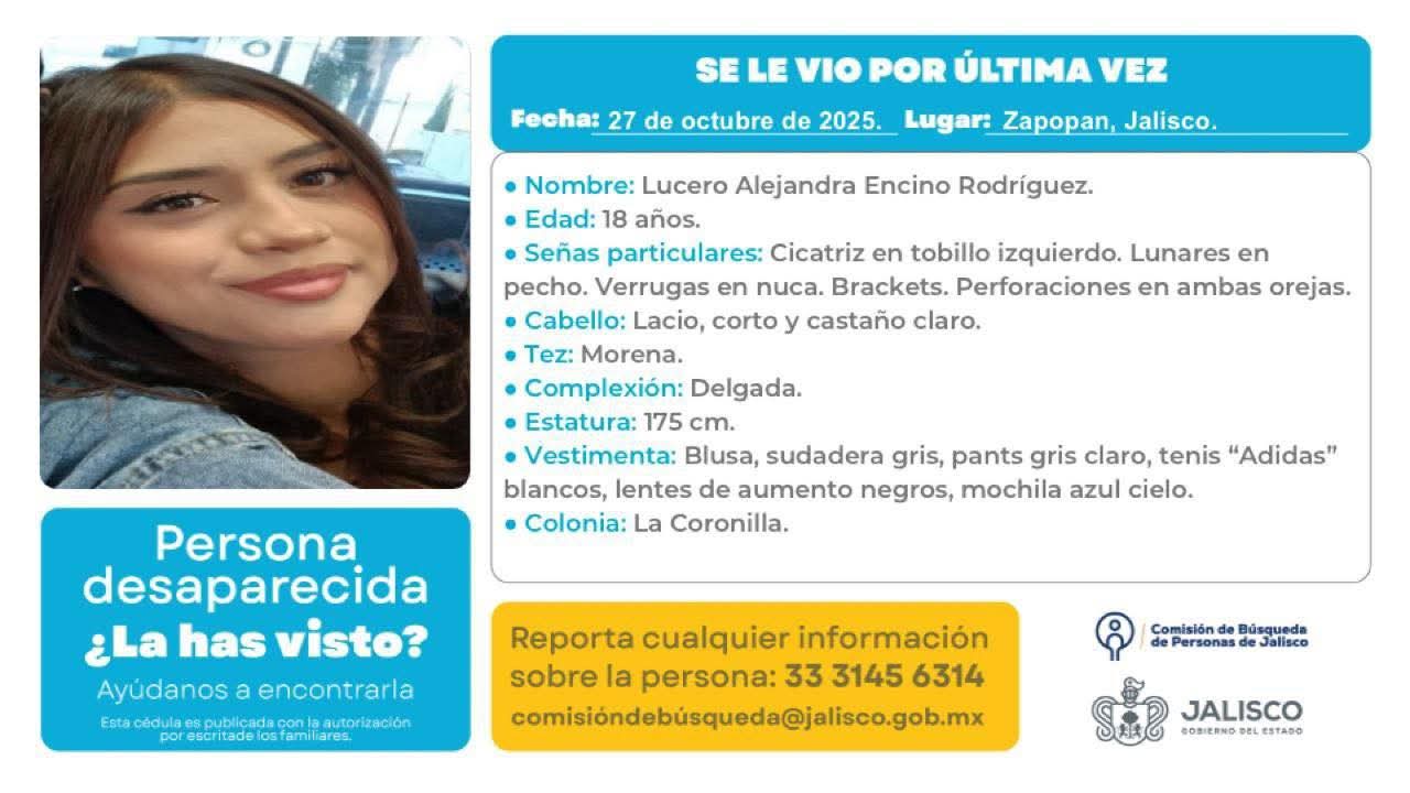 Cualquier persona que tenga datos sobre su paradero puede comunicarse con la Comisión de Búsqueda de Personas del Estado de Jalisco al 33 3145 6314 o enviar un correo a comisiondebusqueda@jalisco.gob.mx.