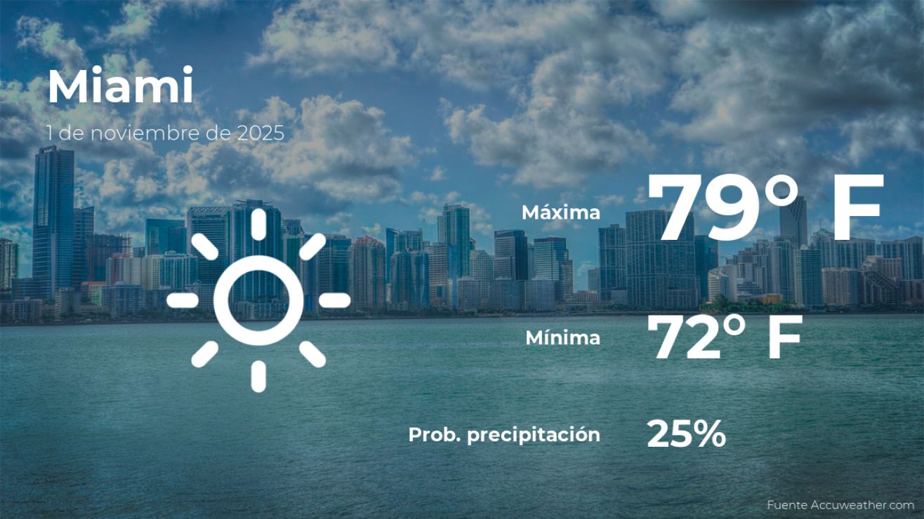 El pronóstico del clima de hoy en Miami para este sábado 1 de noviembre indica que los termómetros llegarán hasta un máximo de 79 grados Fahrenheit (26ºC) en la ciudad. Por su parte, la probabilidad de lluvia será del 25% y tendremos cielos despejados, mientras que las ráfagas de viento llegarán a las 9.32 mph de máxima en el día y los 8.08 mph por la noche.