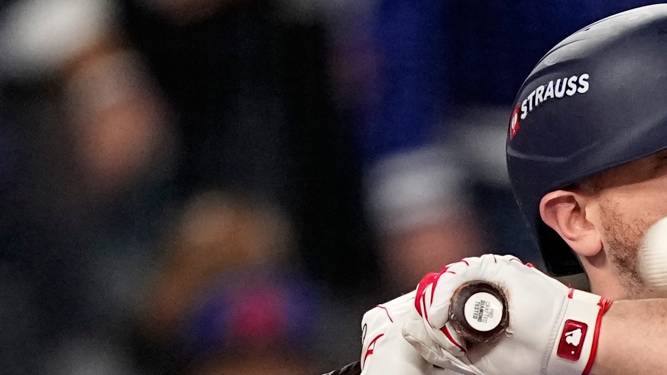 Alejandro Kirk a punto de dar un batazo en el juego 6 de la Serie Mundial. Crédito: Brynn Anderson | AP