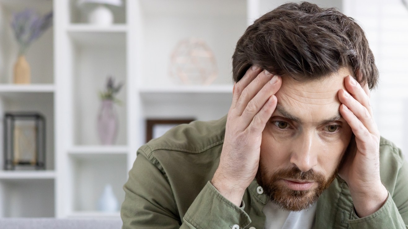 Hombre sintiéndose abrumado y ansioso, experimenta problemas de salud mental, preocupación, frustración. Crédito: voronaman | Shutterstock