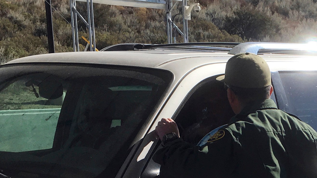 Agentes de la patrulla fronteriza utilizan un perro detector de drogas para revisar vehículos en el puesto de control de Pine Valley, California. Crédito: Elliot Spaga | AP