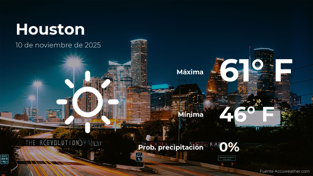 El clima en Houston, Texas, para este lunes 10 de noviembre llegará con cielos totalmente despejados. Según la última información del parte meteorológico provisto por AccuWeather, la temperatura se incrementará hasta un total de 61 grados Fahrenheit (16ºC) de máxima durante el día, mientras que durante la noche ésta descenderá hasta los 46 grados Fahrenheit (8ºC) de mínima.