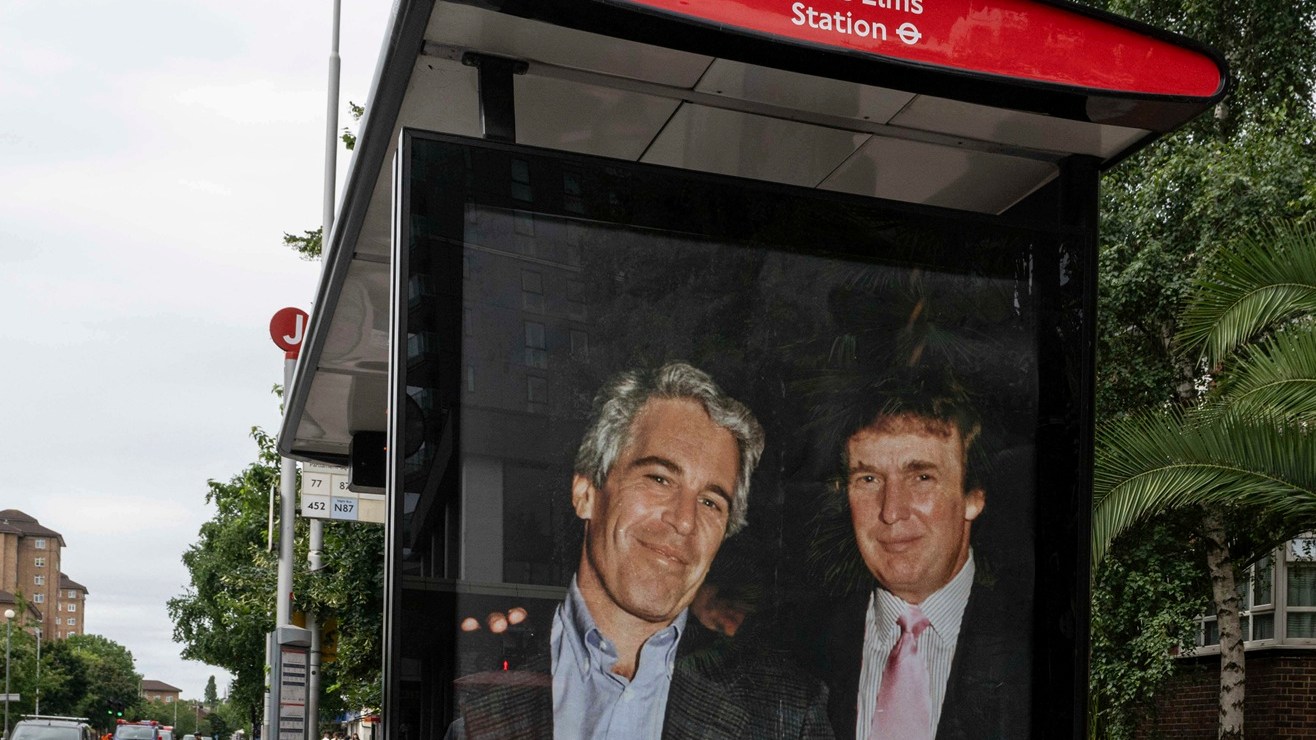 Un cartel en una parada de autobús cerca de la embajada de EE.UU. en Londres muestra al presidente Donald Trump y a Jeffrey Epstein. Crédito: Thomas Krych | AP