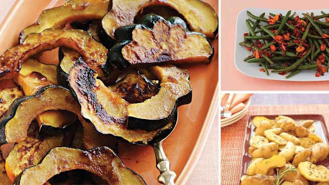 Rodajas de calabaza glaseadas con jarabe de arce, ejotes con almendras y pimentón ahumado, y papas alevines estofadas.