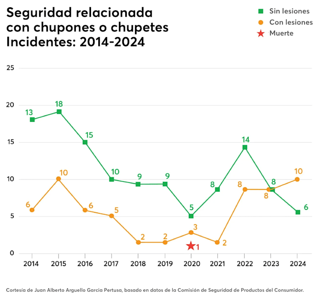 Entre el 2014 y el 2024, la CPSC recibió reportes de 178 incidentes con chupones; para ponerlo en perspectiva, esto representa menos de 18 incidentes reportados por año. (En comparación, en el 2023 la CPSC reportó aproximadamente 60,400 lesiones relacionadas con productos para bebés en niños menores de 5 años que fueron atendidos en salas de emergencia, el 64% de estos casos se relacionaron con sillas altas, cunas/colchones, portabebés y carriolas/cochecitos). De los 178 reportes de accidentes con chupones, un niño falleció, 62 fueron lesiones y 115 no causaron daño físico. Los casos de “sin lesión” pueden incluir problemas con el diseño del chupón o situaciones en las que el chupón estaba roto o defectuoso, pero no llegó a lastimar al niño.