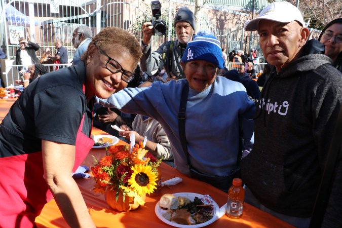 “Este año fue muy difícil. Mucha gente está sufriendo. No tiene comida”, declaró la alcaldesa Karen Bass, quien, después de servir casi un centenar de platillos a los comensales, derramó algunas lágrimas.