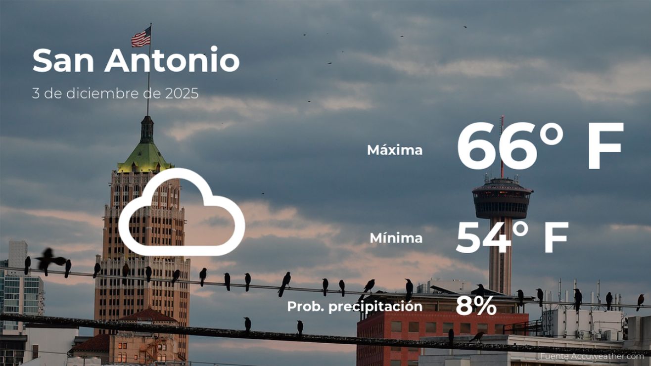 El pronóstico del tiempo en San Antonio, Texas, para mañana indica que habrá cielos cubiertos con lluvia. Las temperaturas tendrán una variación entre los 43 y los 57 grados Fahrenheit (6 y 14ºC).