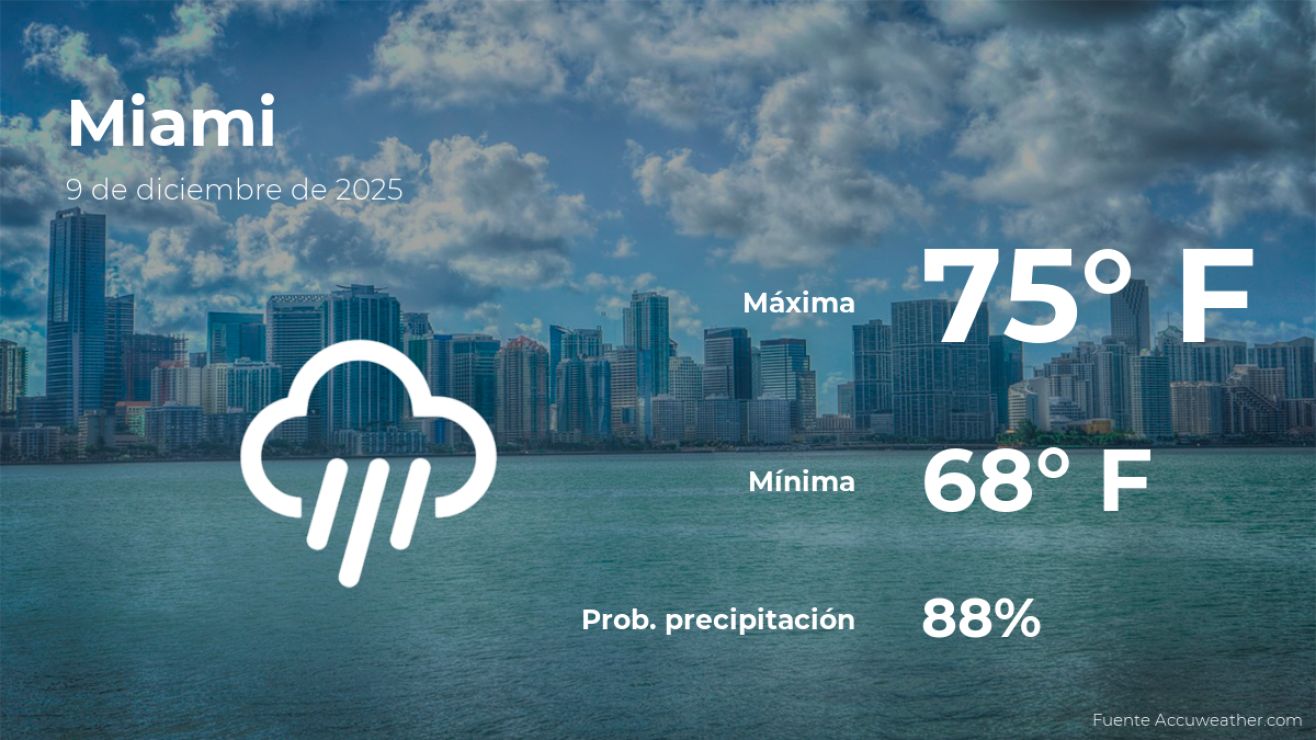 El pronóstico del clima de hoy en Miami para este martes 9 de diciembre indica que los termómetros llegarán hasta un máximo de 75 grados Fahrenheit (24ºC) en la ciudad. Por su parte, la probabilidad de lluvia será del 88% y el cielo estará cubierto, mientras que las ráfagas de viento llegarán a las 14.91 mph de máxima en el día y los 8.08 mph por la noche.