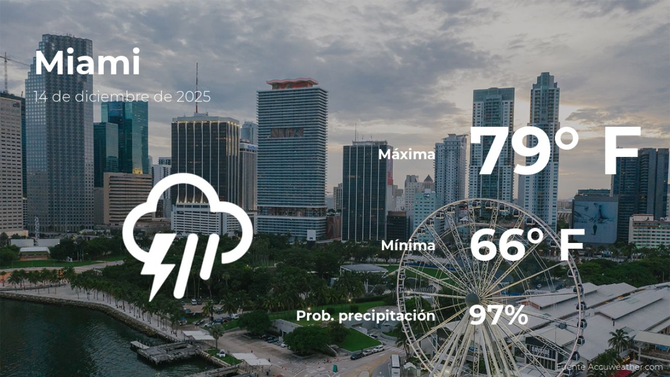 Conoce cómo estará el tiempo en Miami, Florida, para hoy domingo 14 de diciembre. Antes de salir de tu casa, descubre el pronóstico meteorológico y las condiciones climáticas más relevantes para este día.