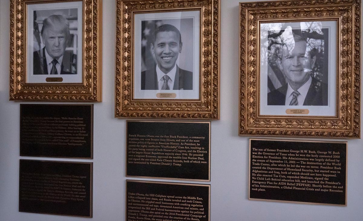 Como parte de la renovación de la Casa Blanca ordenada por Donald Trump se mandó a colocar algunas placas debajo de los retratos de los expresidentes que decoran parte de la Columnata del Ala Oeste, pero lo controversial del asunto es que algunos de los textos descriptivos fueron escritos por el propio republicano criticando a demócratas como Joe Biden y Barack Obama.