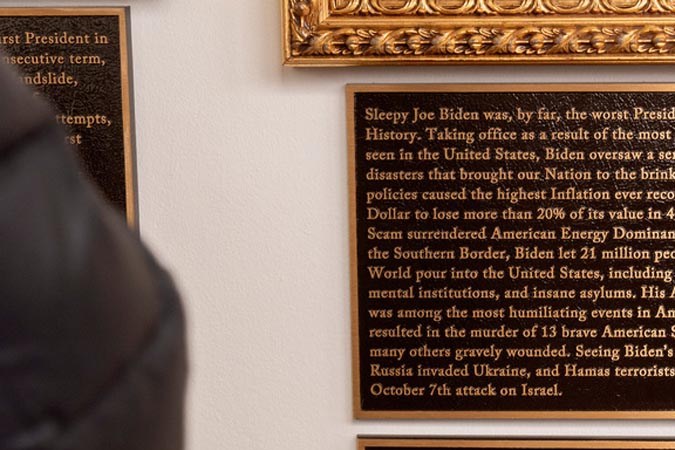 “Sleepy Joe Biden fue, por lejos, el peor presidente en la historia de Estados Unidos como resultado de las elecciones más corruptas jamás vistas. Biden supervisó una serie de desastres sin precedentes que llevaron a nuestra nación al borde de la destrucción”, señalan algunas frases que aparecen debajo del retrato correspondiente al mandatario obligado por su propio partido a renunciar a la idea de reelegirse.