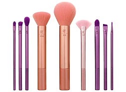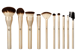 El set de brochas incluye: brocha mini contorneada para base, brocha grande para corrector, brocha densa para bronceador, brocha pequeña angular para el rostro, brocha plana pequeña para polvos, brocha mini para sombras, brocha mini tipo lápiz, esponja detallada para difuminar y brocha mediana para difuminar.