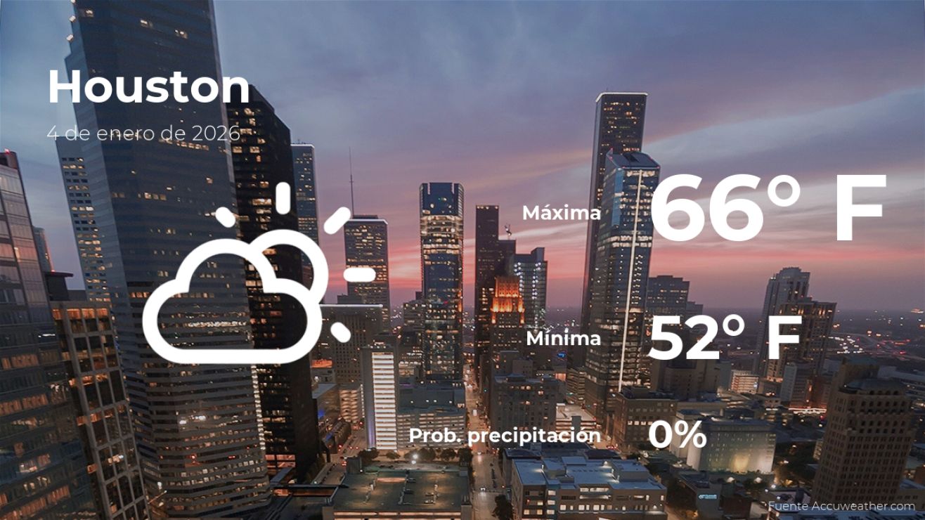 El clima en Houston, Texas, para este domingo 4 de enero tendrá nubes y claros. Según la última información del parte meteorológico de AccuWeather, la temperatura ascenderá hasta los 66 grados Fahrenheit (19ºC) de máxima durante el día, mientras que para la noche bajará hasta los 52 grados Fahrenheit (11ºC) de mínima.