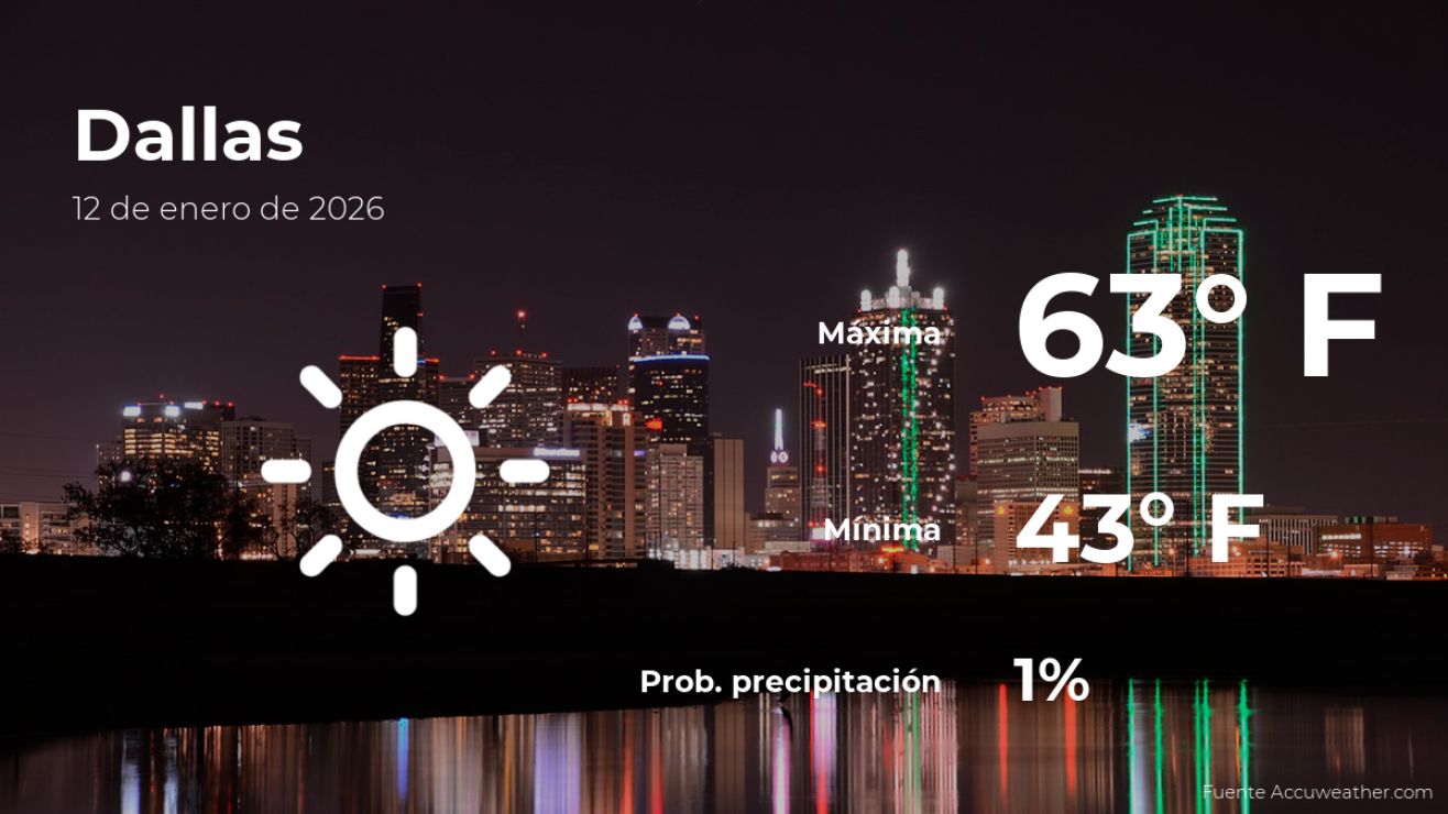 Este lunes 12 de enero se espera que la temperatura en Dallas, Texas, aumente hasta un máximo de 63 grados Fahrenheit (17ºC). La probabilidad de lluvia será del 1% y se prevén cielos despejados. Por otro lado, las predicciones estiman ráfagas de viento de hasta 5.59 millas por hora.