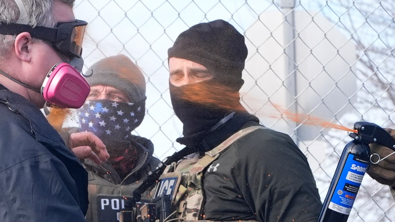 Agente de ICE dispara gas pimienta contra un manifestante frente al Edificio Federal Bishop Whipple, el lunes 12 de enero de 2026, en Minneapolis. Crédito: Jen Golbeck | AP