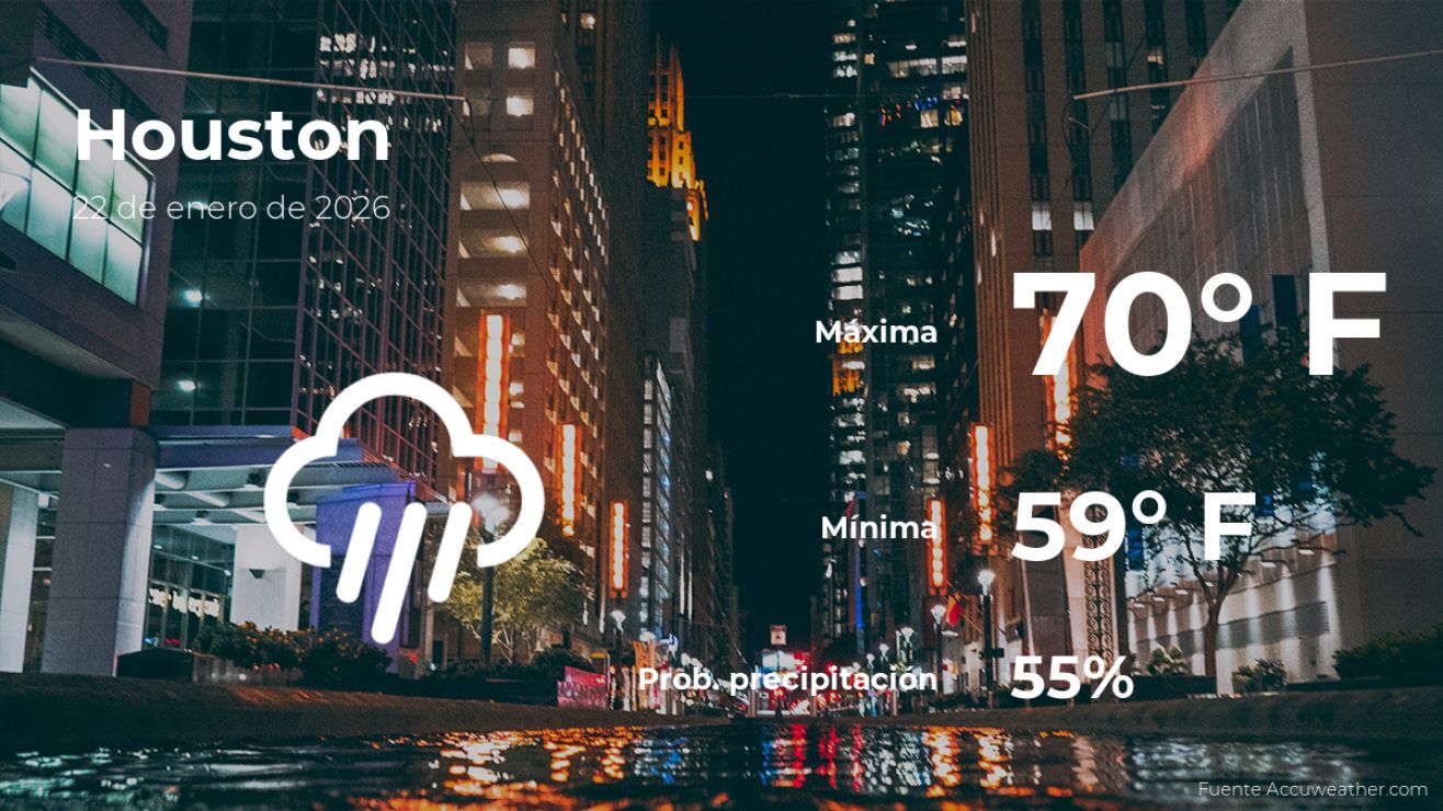 El clima en Houston, Texas, para este jueves 22 de enero se desarrollará con cielos cubiertos. Según la última información del parte meteorológico de AccuWeather, la temperatura alcanzará los 70 grados Fahrenheit (21ºC) de máxima durante el día, mientras que para la noche bajará hasta los 59 grados Fahrenheit (15ºC) de mínima.