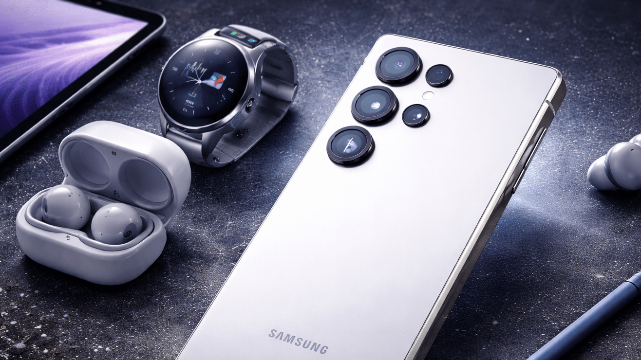 El nuevo Galaxy S26 Ultra junto a sus accesorios: un ecosistema diseñado para destacar. Crédito: Imagen creada con AI. | Impremedia